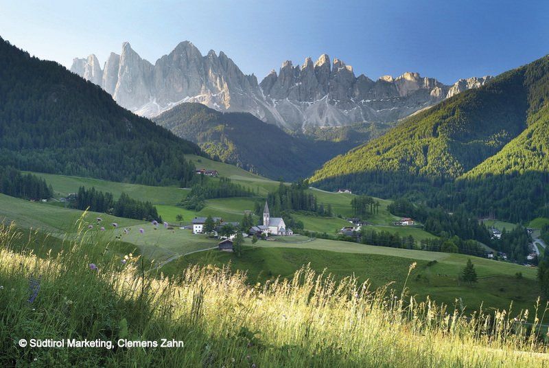 Bilder aus Südtirol -- Im Villnösstal bei St. Magdalena laden weitläufige Almwiesen zu schönen Wanderungen mit Fernblick auf das Bergpanorama der Geisler Gruppe.