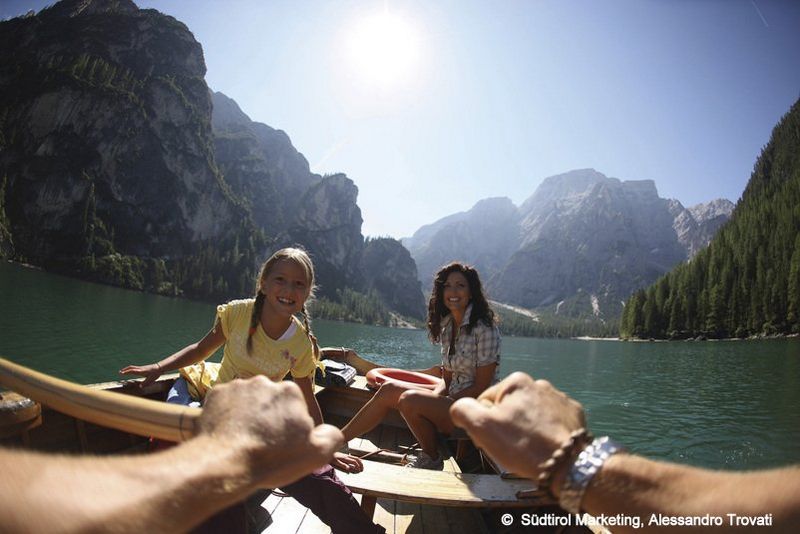 Bilder aus Südtirol -- Rudern auf dem Pragser Wildsee inmitten des Naturparks der Dolomiten ist ein einmaligen Erlebnis für Familien.